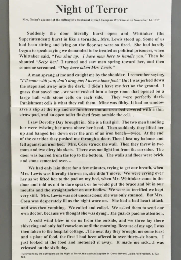 "Night of Terror," Mrs. Nolan's account of the suffragists' treatment at the Occoquan Workhouse on November 14, 1917.