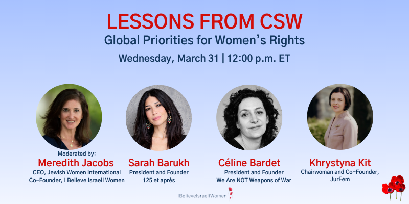 I Believe Israeli Women invites you to attend a webinar on Tuesday, March 31 at 12:00 PM ET, “Lessons from CSW: Global Priorities for Women’s Rights.”