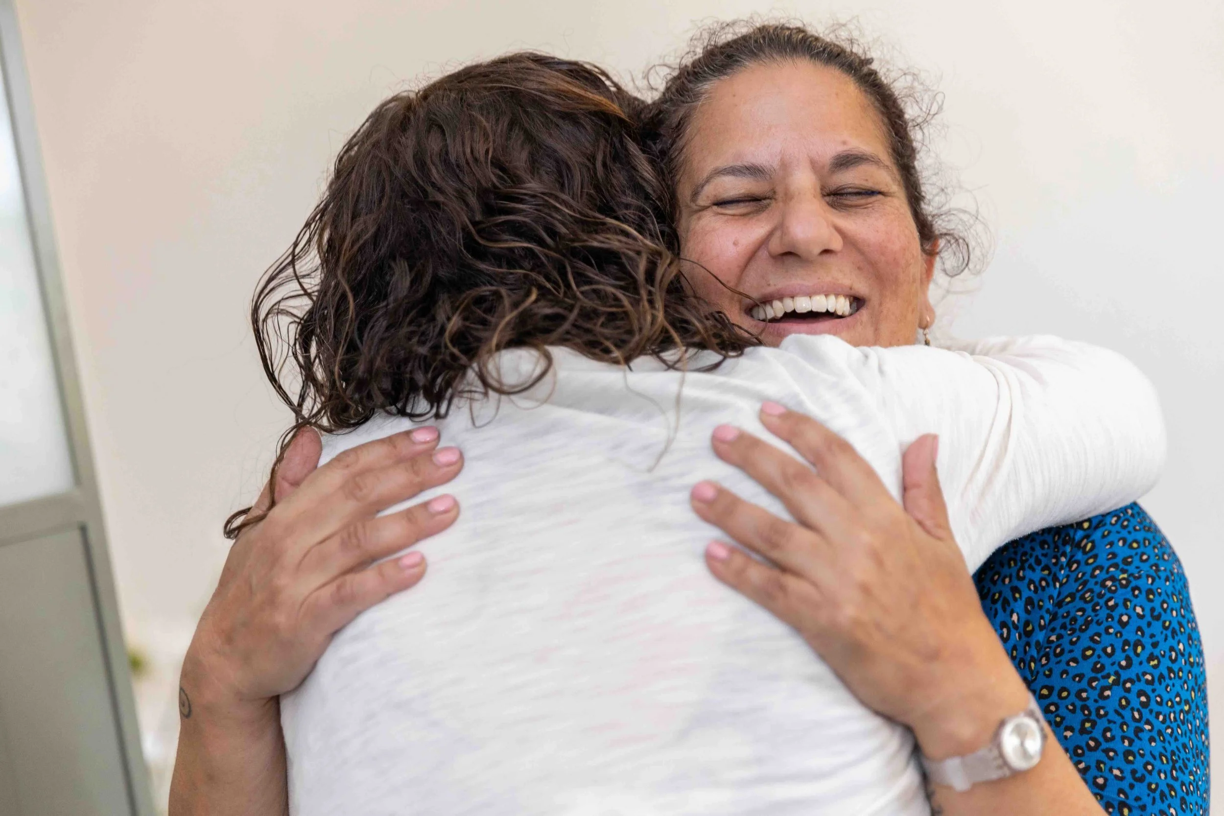 A staff member at the Tel Aviv Rape Crisis Center embraces an IBIW delegate (Photo by Yael Ilan)